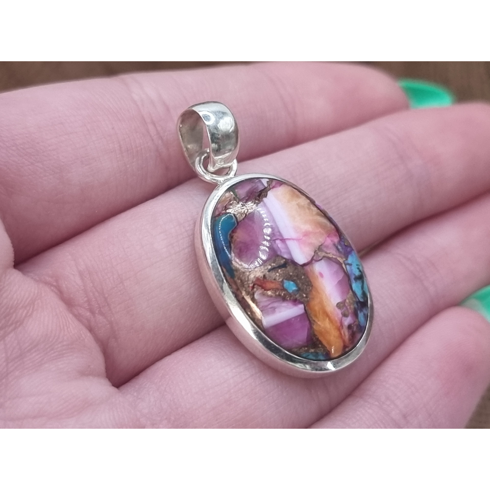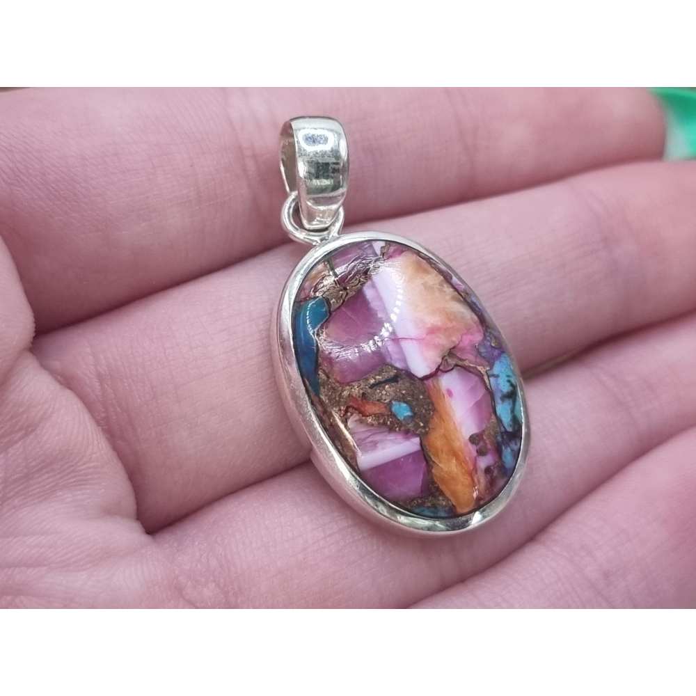 Prachtige ovale echt zilveren pink oyster turquoise.
