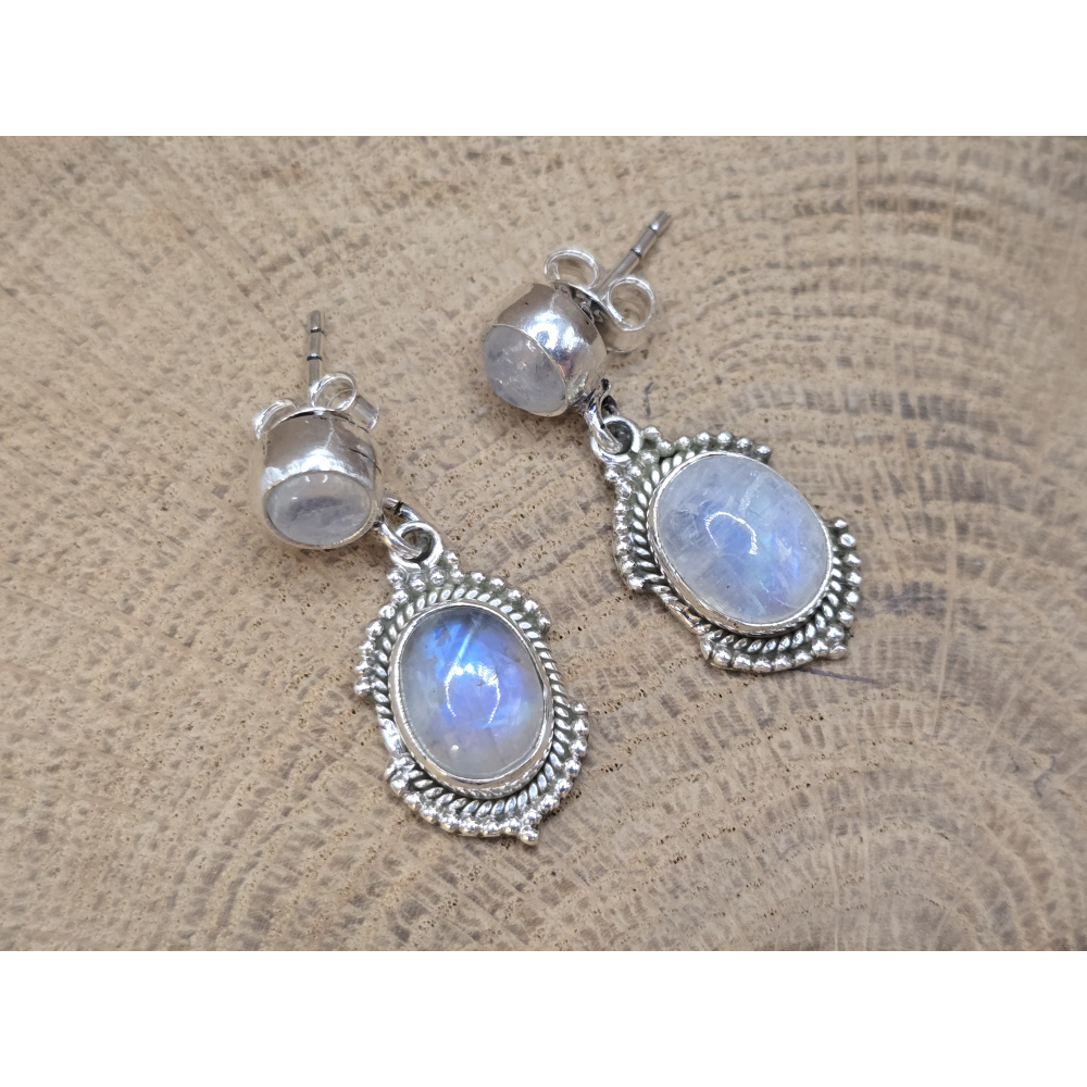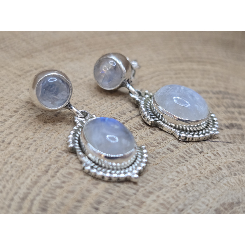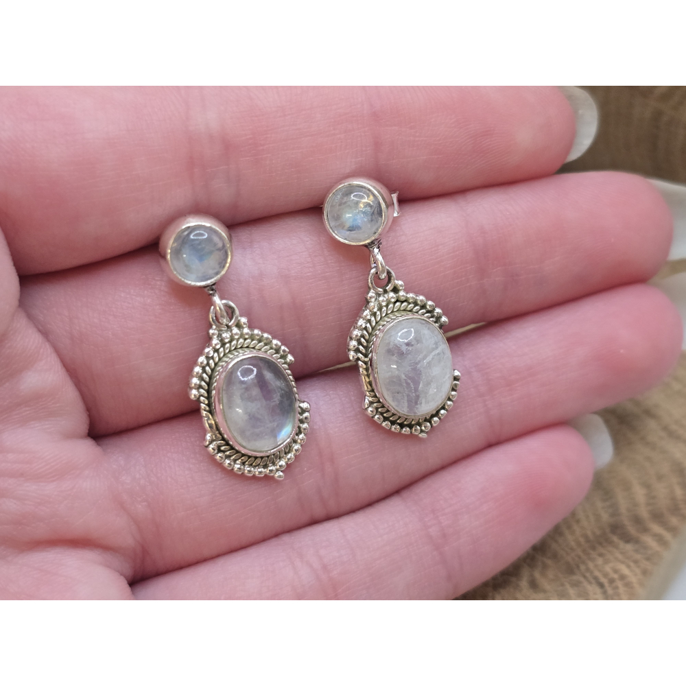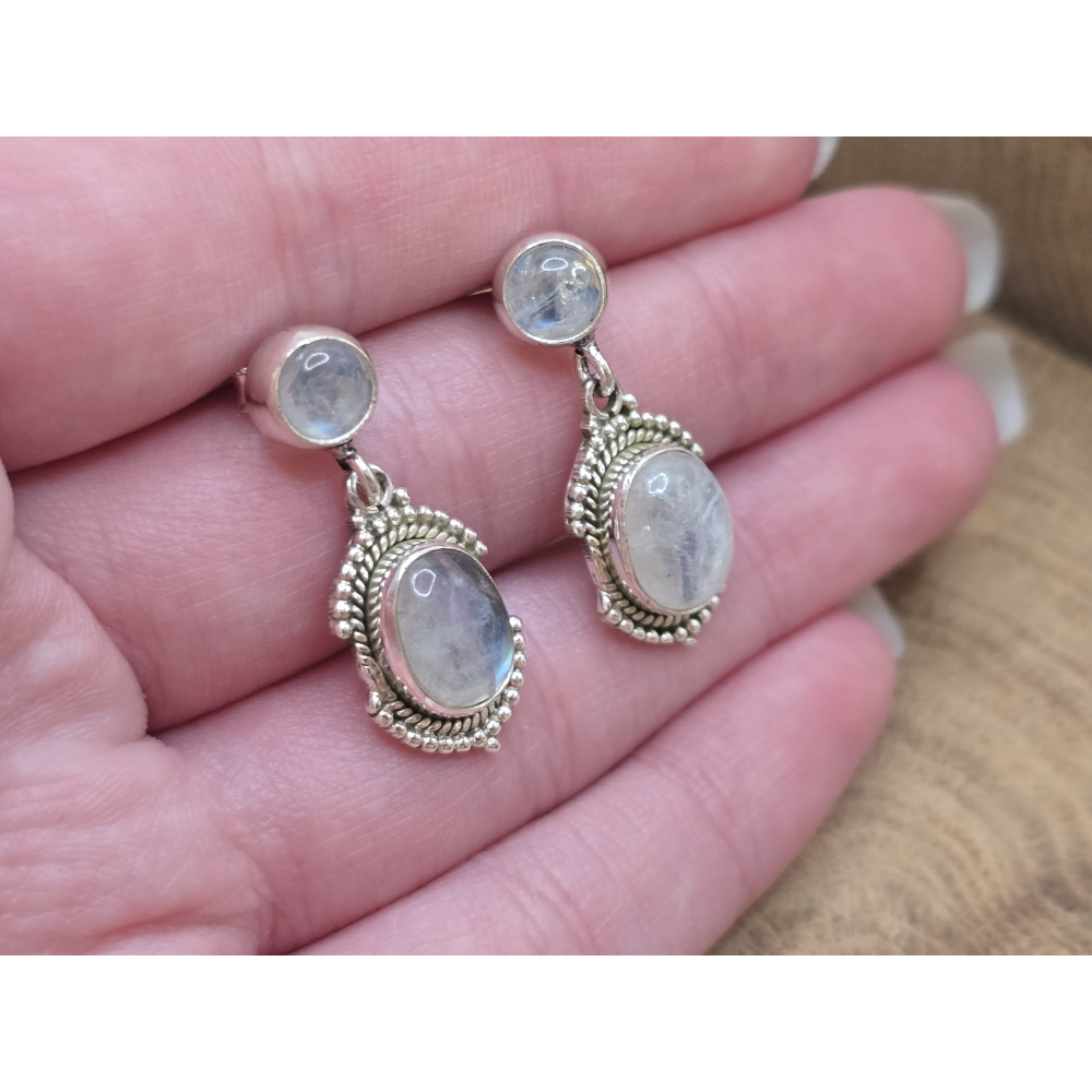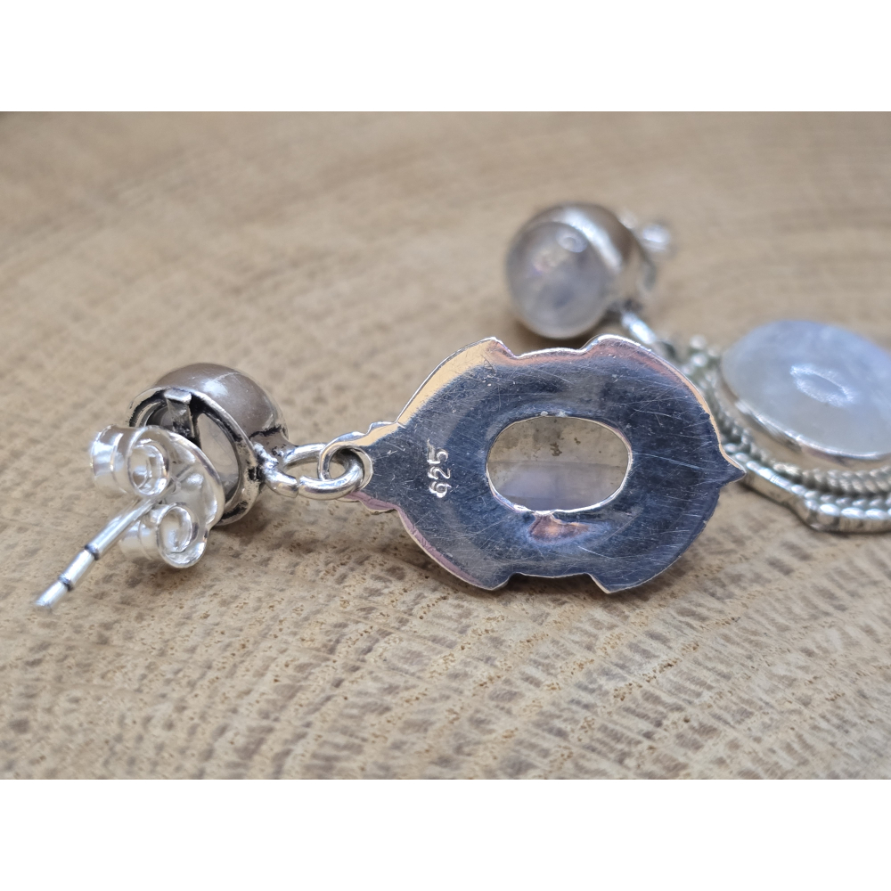 Prachtige echt zilveren oorbellen met maansteen stekers hangend.