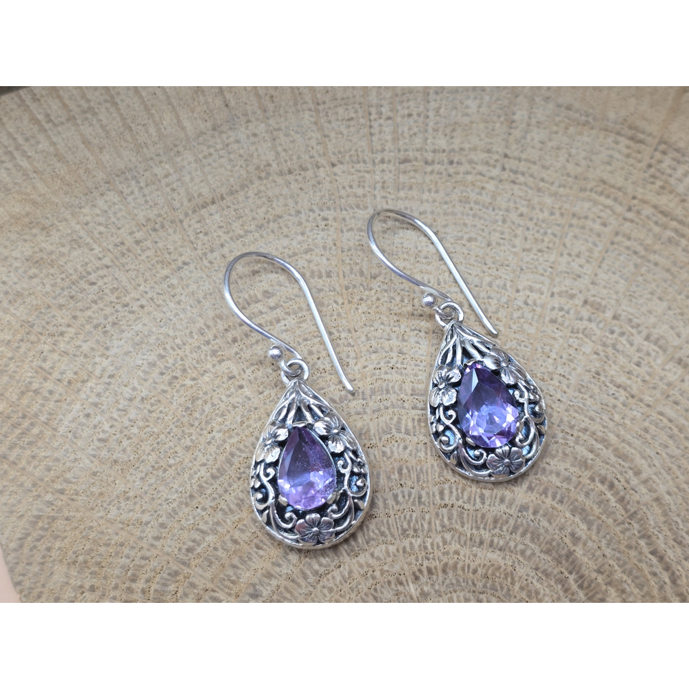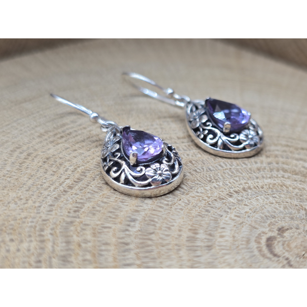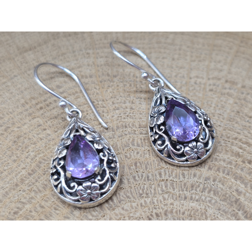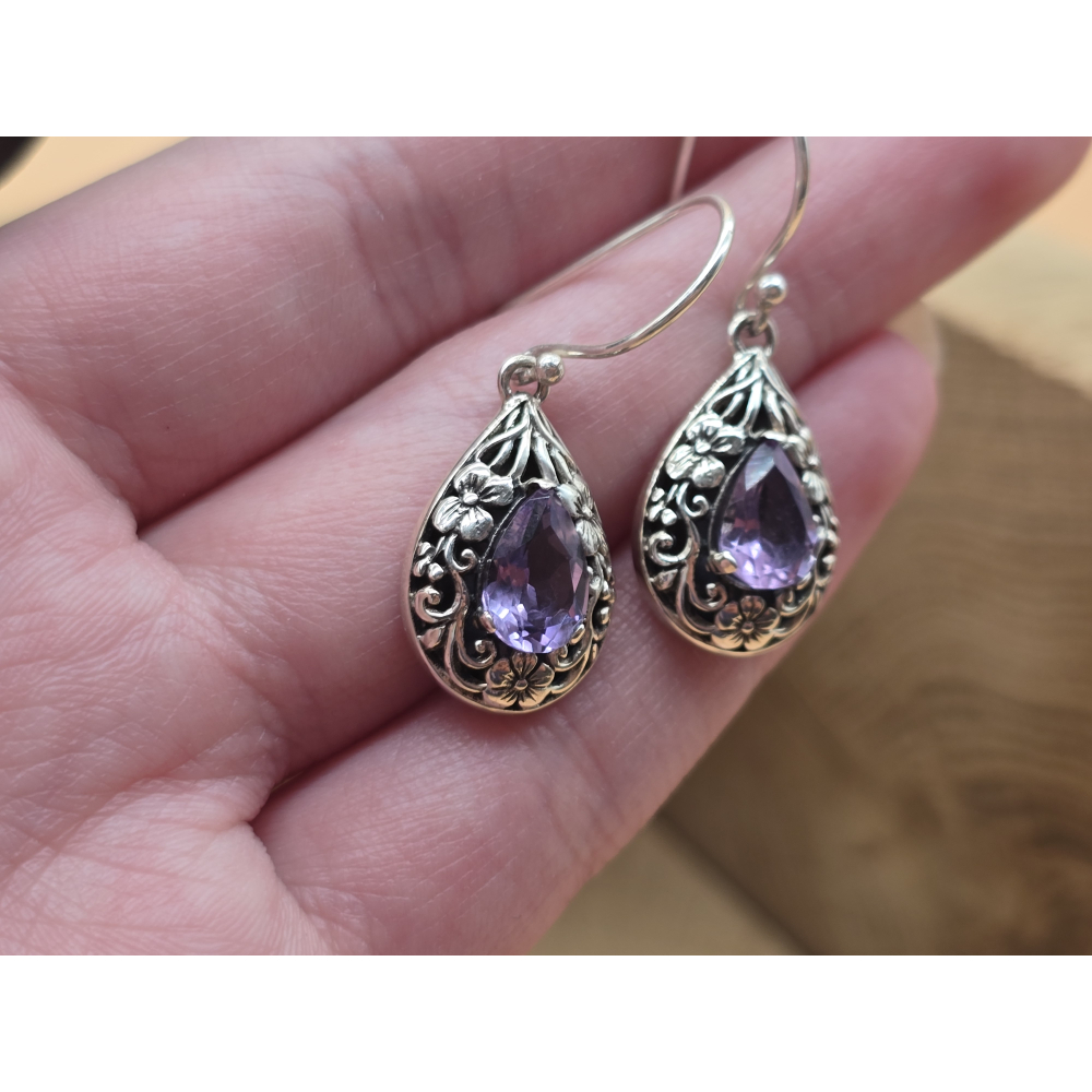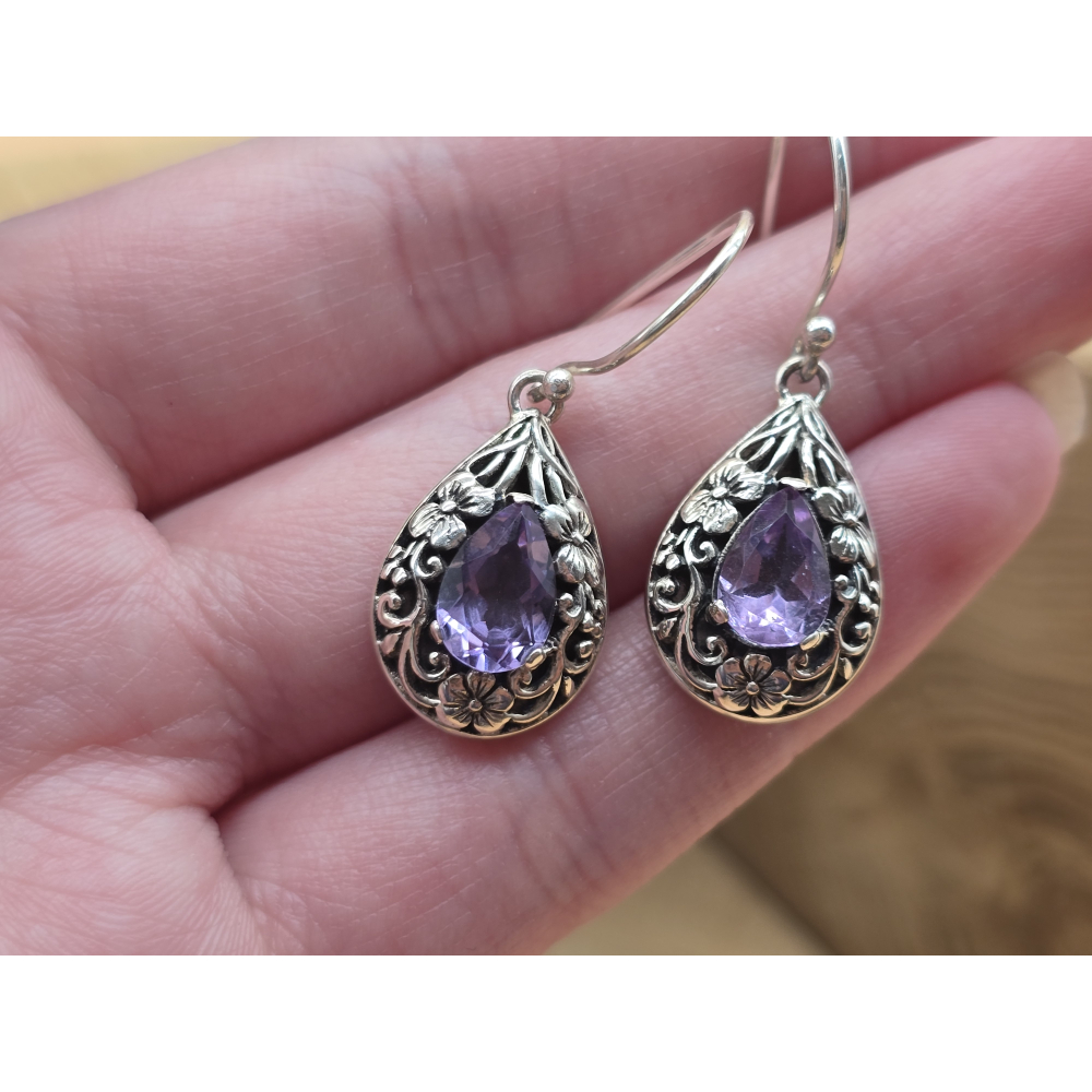 Prachtige oorbel hangers met Amethist en bloemen.