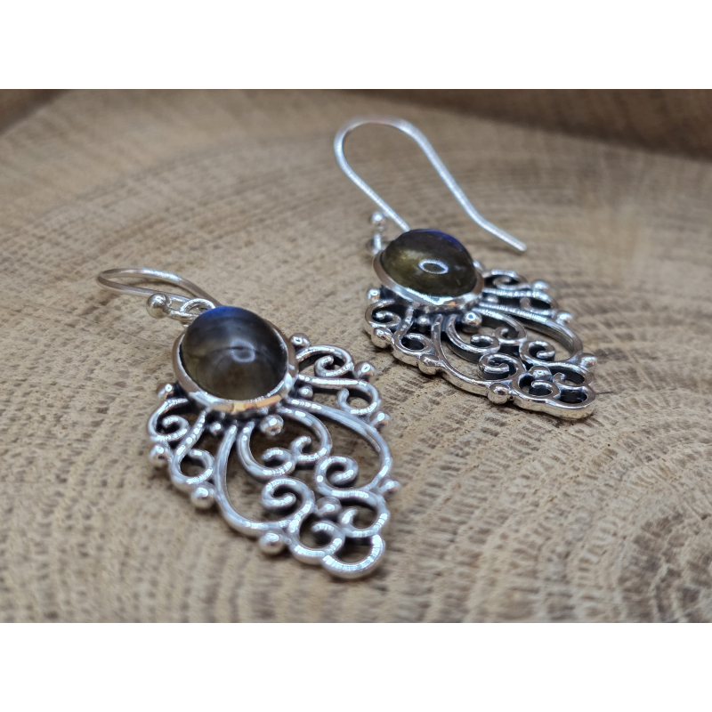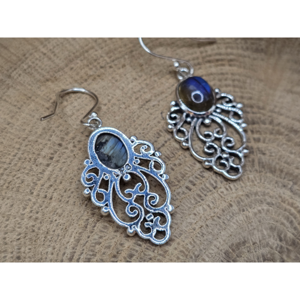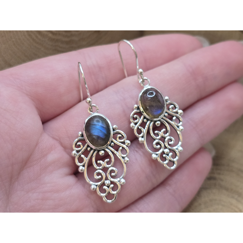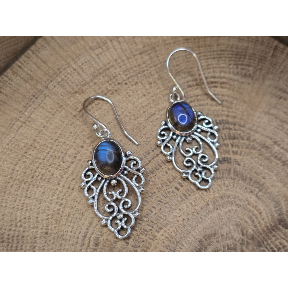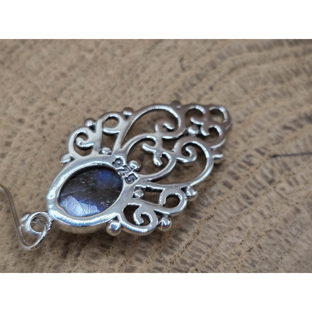 Prachtig bewerkte echt zilveren labradoriet oorbellen hangers.